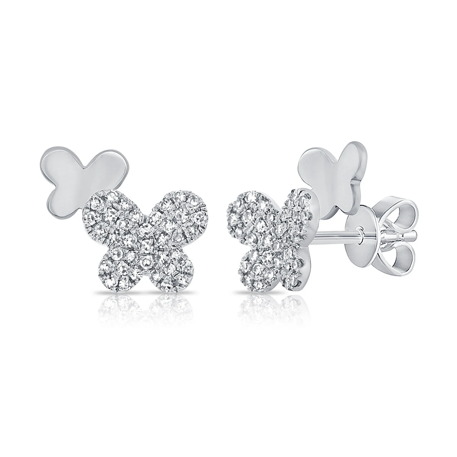 ◈ Add a dazzling and whimsical look with these eye-catching double butterfly stud earrings. Finely Crafted in 14K Solid gold, each butterfly features 37 single-cut diamonds. They are available in 14K gold, 14K white gold or 14K rose gold and these post earrings are comfortably secured with pushbacks.