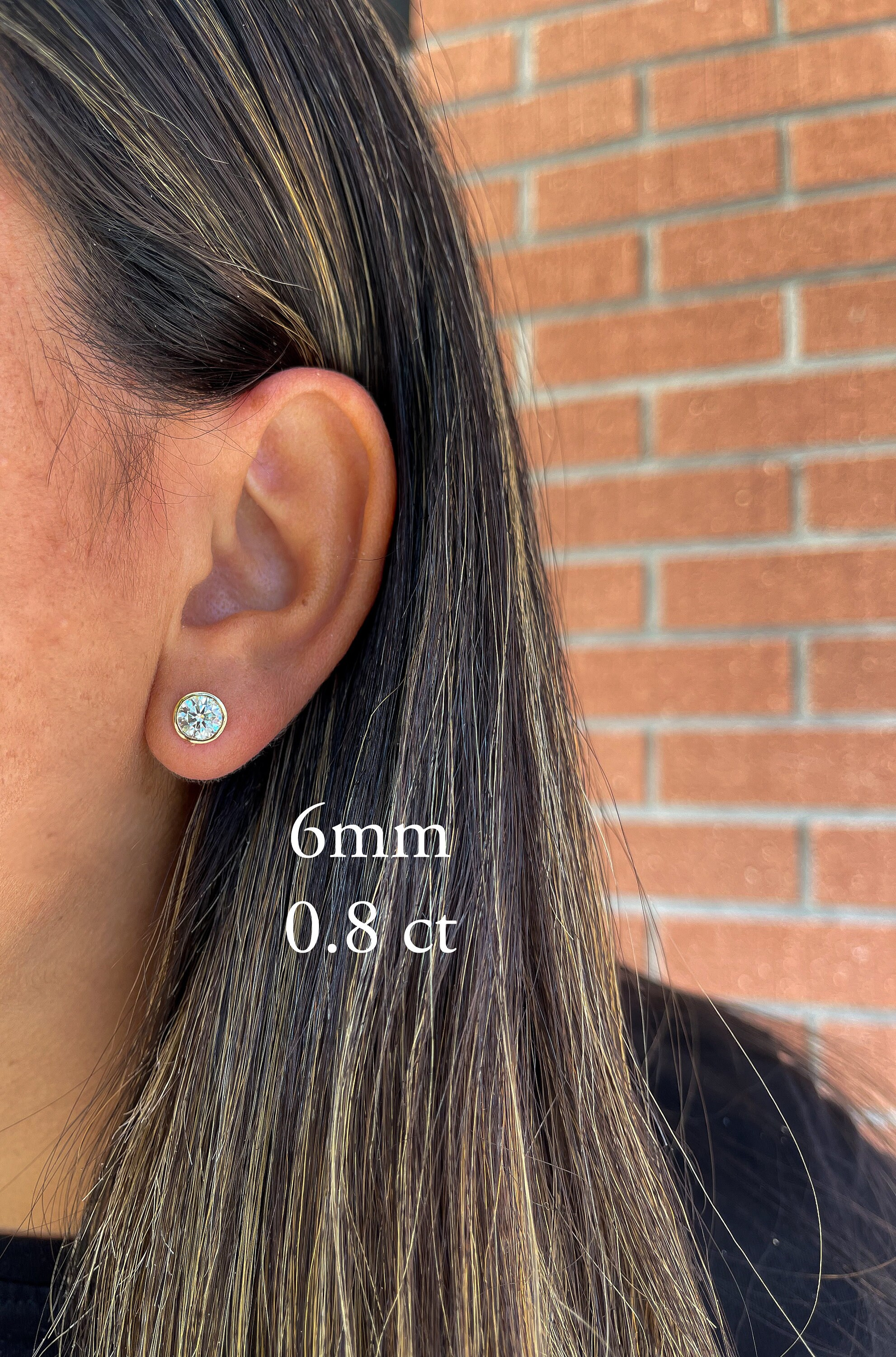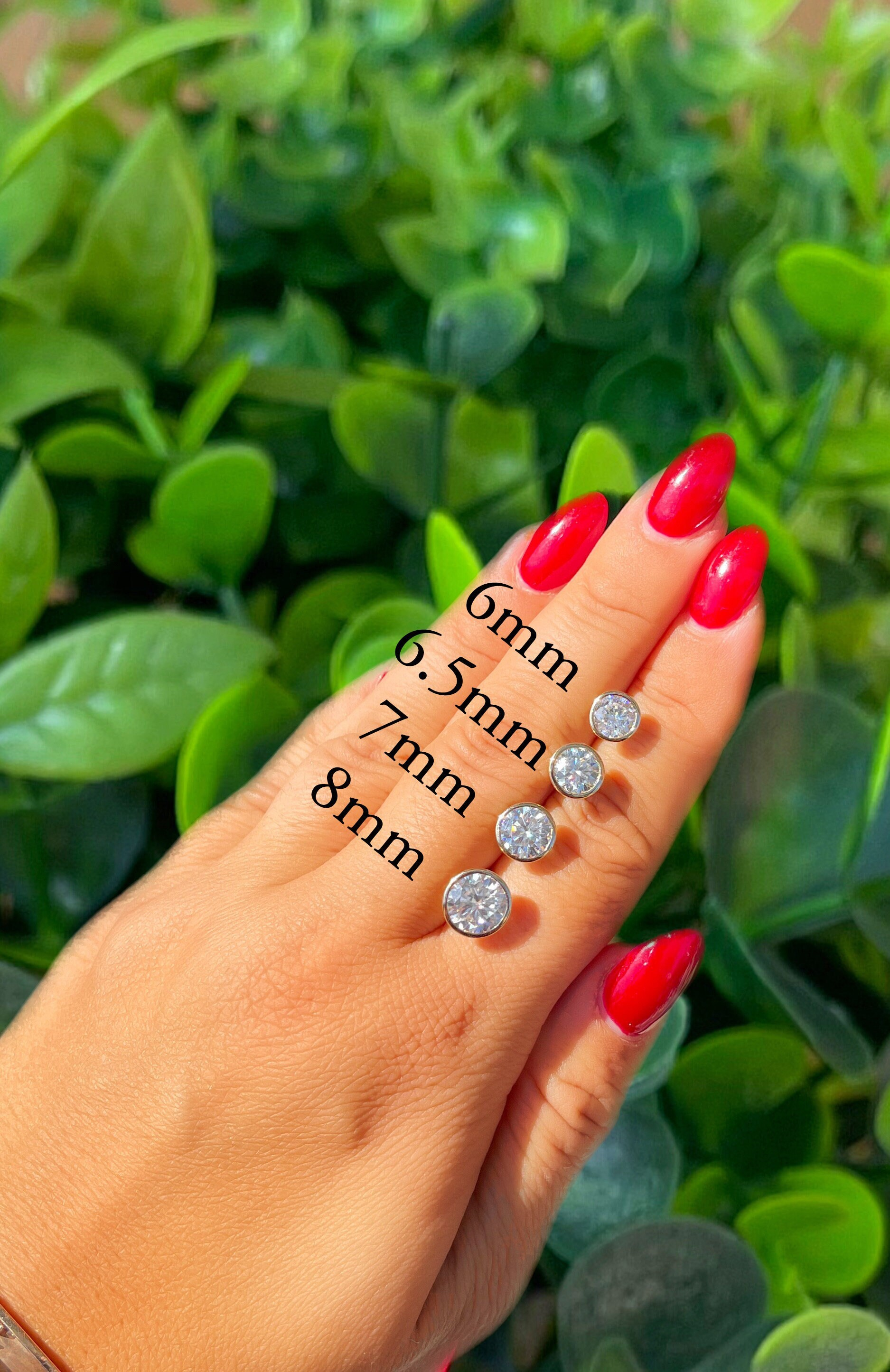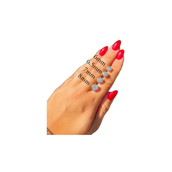 ◈Details◈ ◈Sizes Available: 3mm .10 Carat Each (.20 pair) 4mm .25 Carat Each (.50 pair) 5mm .50 Carat Each (1 TCW pair) 6mm .80 Carat Each (1.6 TCW for the pair) 6.5mm 1 Carat Each (2 TCW for the pair) 7mm 1.2 Carat Each (2.4 TCW for the pair) 8mm 2 Carat Each (4 TCW for the pair) ◈Available In: 14K Solid Yellow Gold 14K Solid White Gold 14K Solid Rose Gold ◈Setting: Martini Bezel ◈Shape: Round ◈Metal of setting: 14K Solid Gold ◈Closure: Pushback (available in screwback as well) ◈Color: D Color ◈Clarity: VVS1
