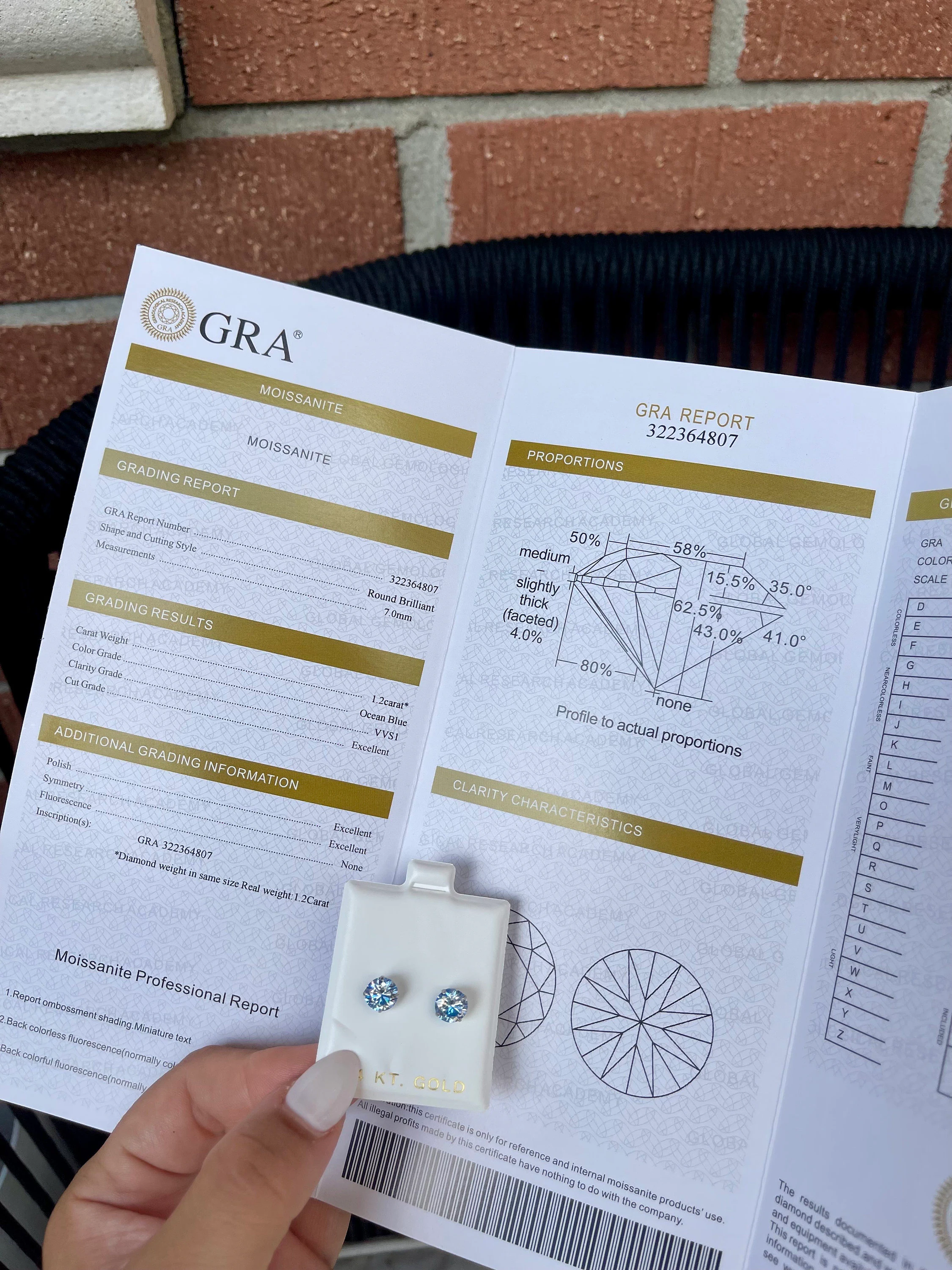 Make waves with these sleek 14K Solid Gold Martini Studs, featuring dazzling Ocean Blue Moissanite stones. The round, GRA Certified D Color VVS1 Moissanites offer a mesmerizing sparkle, perfectly set in a minimalist 3-prong design. Crafted for both comfort and security, these studs come with screwback closures to ensure they stay in place no matter where life takes you. These earrings are your go-to for an effortlessly cool look that stands out. Each pair of earrings will receive 2 GRA certificated for each stone. The color used is D colored moissanites (colorless) with VVS1-clarity quality. The sparkle, brilliance, and fire is breathtaking! They make the perfect gift that can be worn a lifetime.