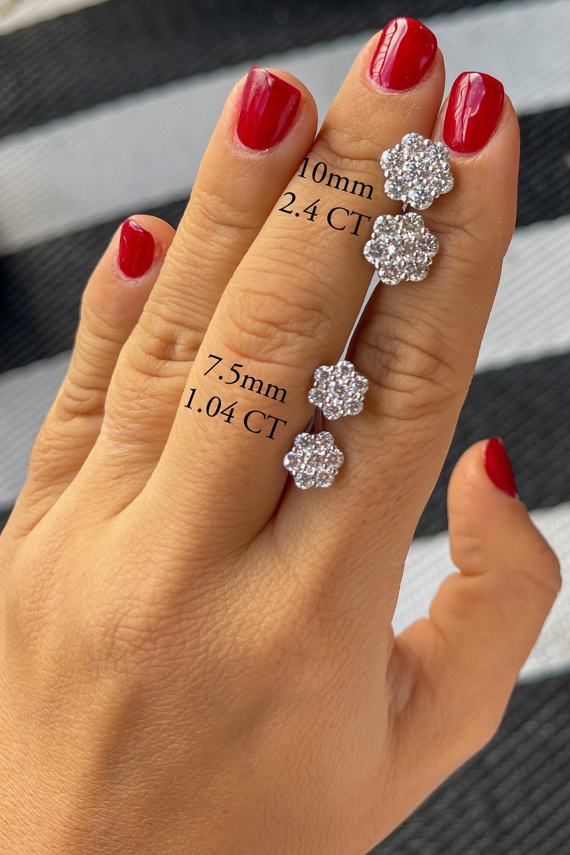 ◈ These classic Moissanite cluster flower studs earrings are the perfect modern studs for everyday wear. The sparkling moissanites and prong set surrounding sparkle away brilliantly. The color used is DEF colored moissanites (colorless) with VS-clarity quality. The sparkle, brilliance, and fire is breathtaking. These post earrings secure comfortably with Screwbacks. Surprise that special person in your life with a flower arrangement that will last a lifetime and can be worn for any occasion.