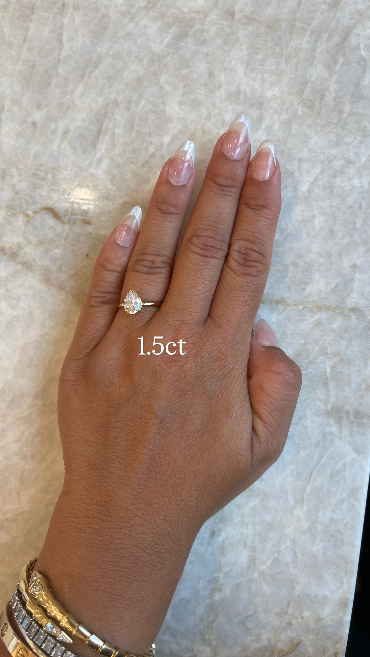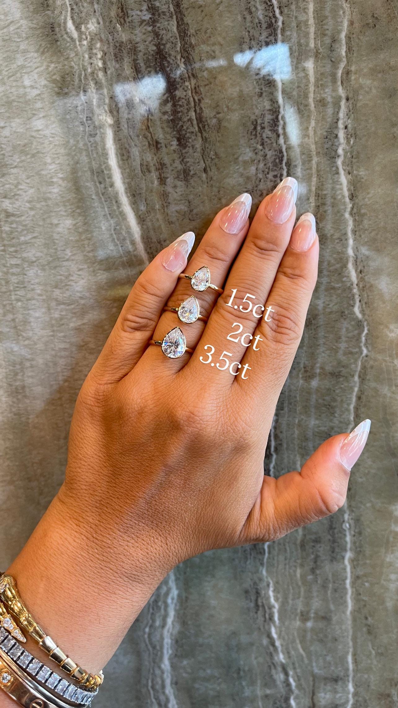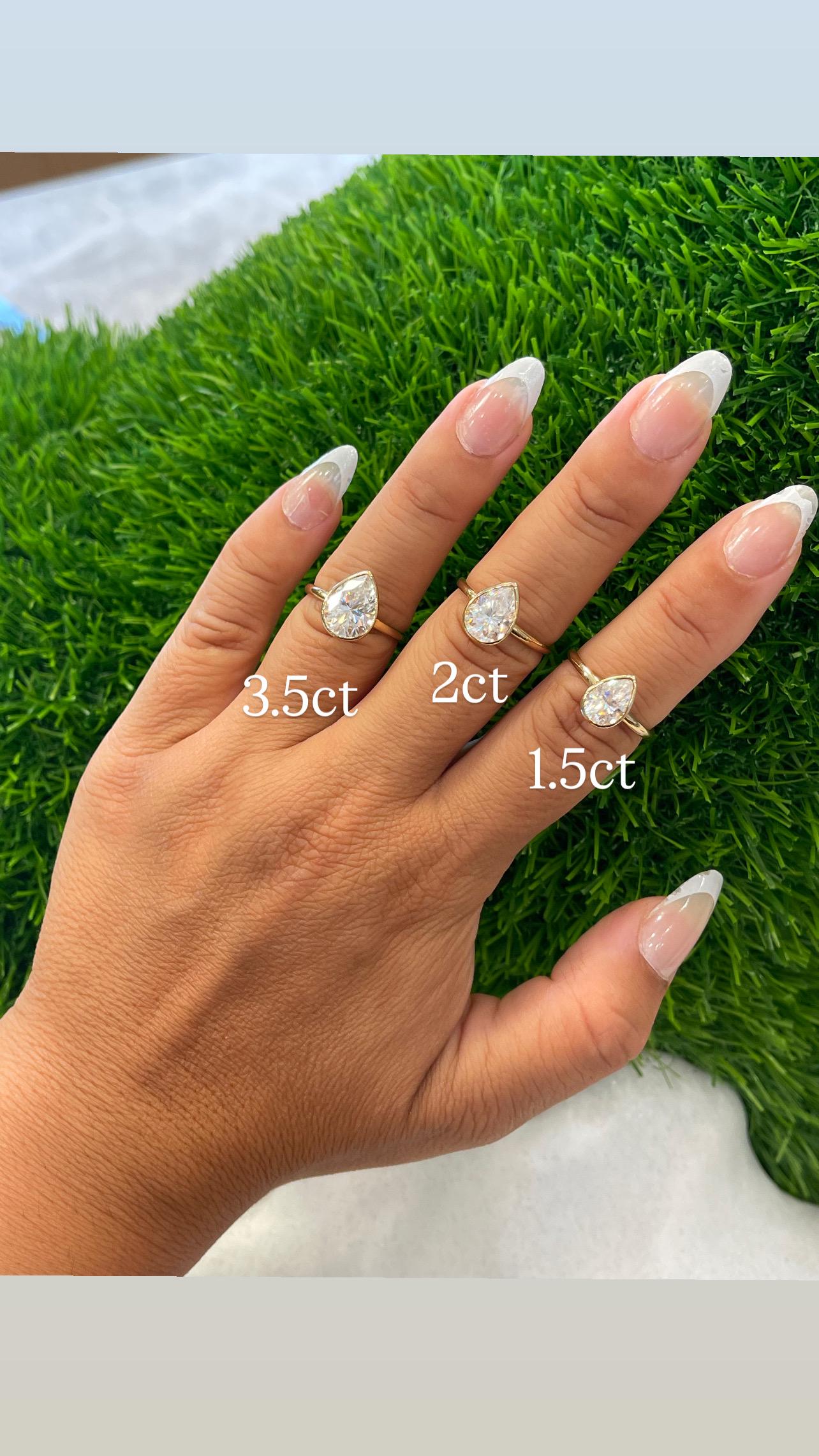 These elegant 14K solid gold bezel-set moissanite rings feature a stunning pear-shaped sparkle in your choice of 1.5ct, 2ct, or 3.5ct
